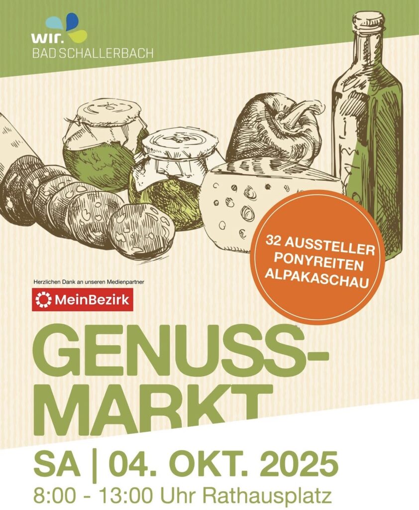 Am Samstag 30.September 2023 findet von 08:00 bis 14:00 Uhr der Regionale Genussmarkt am Rathausplatz in Bad Schallerbach statt. Auch wir sind mit unseren Produkten vor Ort und freuen uns auf Euren Besuch!